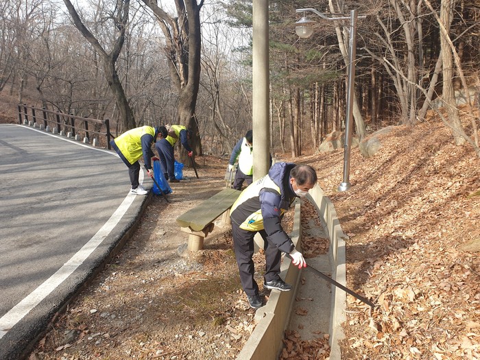 인천 강화군시설관리공단은 27일 설맞이 환경정화 캠페인을 마니산 등산로와 정수사 주변에서 실시했다. 사진은 이날 공단 임직원들이 마니산 등산로에서 쓰레기를 줍고 있는 모습. (사진제공=강화군청)