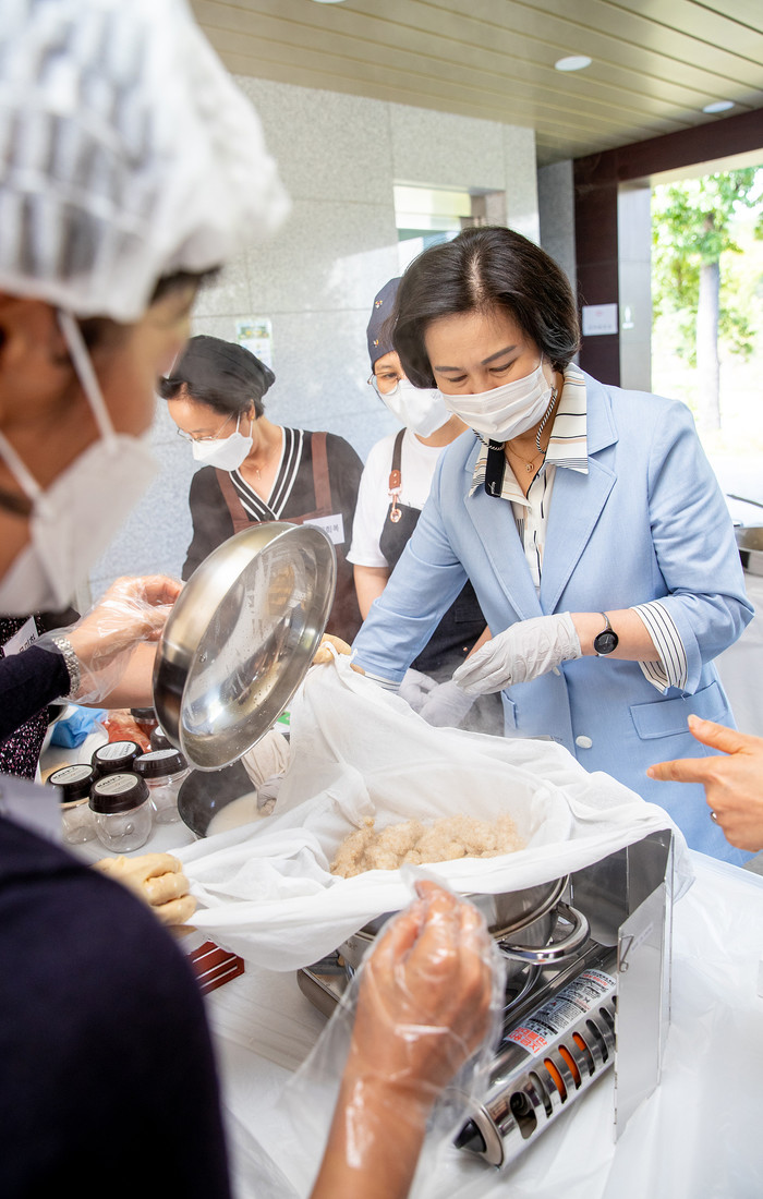 김수영 양천구청장이 27일 도시농업공원에서 운영되는 양천장독대 장류제조·관리사 주민기술학교를 방문해 전통장 제조 과정을 살펴보고 있다.