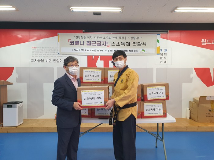서울 은평구 진관동 주민센터 직원들이 최근 코로나19 확산 방지와 침제된 경제 활성화를 위해 지역내 11개 태권도장에 200여개의 손소독제를 기부했다. 사진은 손소독제 기부 모습. (사진제공=은평구청)