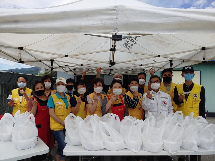 경기 양주시 회천1동 적십자봉사회가 최근 초복을 맞아 직접 만든 '사랑의 삼계탕'을 개별포장해 지역내 홀몸노인과 저소득가정 등 100여가구에 비대면 방식으로 전달했다. 사진은 이날 봉사에 참여한 회원들이 기념촬영을 하는 모습. (사진제공=양주시청)