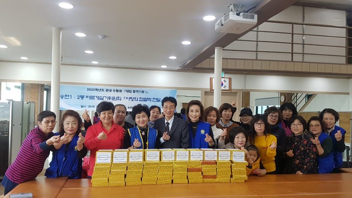 인천 동구 송현1·2동 행정복지센터는 11일 지역내 수능 수험생들을 격려하기 위한 '찹쌀떡 나눔 행사'를 개최, 정성스럽게 찹쌀떡을 만들고 포장해 수험생들에게 격려의 인사와 함께 전달했다. 사진은 포장 후 기념촬영을 하는 모습. (사진제공=동구청)