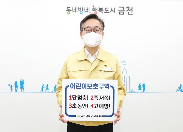 유성훈 금천구청장이 18일 ‘어린이 교통안전 릴레이 챌린지’에 동참했다. 이 챌린지는 행정안전부에서 어린이 보호구역내 교통사고 예방과 교통안전 실천문화 확산을 위해 시작했다. 사진은 유 구청장이 ‘1단 멈춤, 2쪽 저쪽, 3초 동안, 4고 예방’이라는 교통안전 메시지를 들고 있는 모습. (사진제공=금천구청)