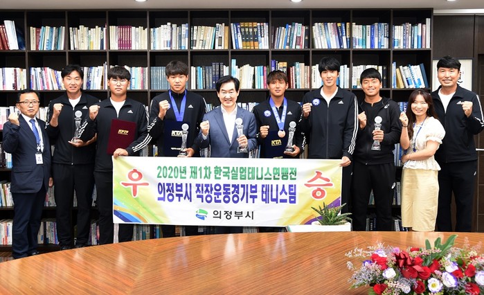 안병용 경기 의정부시장은 20일 제1차 한국실업테니스연맹전 및 전국종별테니스대회에서 우수한 성적을 거둔 의정부시청 테니스팀 선수들을 축하했다. 의정부시청은 대회 초반 단체전 준우승으로 기세를 휘어잡으며 남자 복식에서도 정윤성, 정영석 선수가 준우승의 결과를 안았다. 사진은 안 시장(가운데) 및 선수들이 기념촬영을 하는 모습. (사진제공=의정부시청)