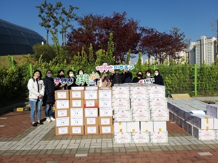 인천 미추홀구 종합자원봉사센터는 최근 코로나19로 온라인 개학을 맞은 지역사회 취약계층 아동 170명에게 전달할 ‘안녕 키트’를 제작했다. 키트에는 즉석밥, 라면, 간식류 등 생필품 12종이 담겨 있다. 사진은 센터 관계자들이 기념촬영을 하는 모습. (사진제공=미추홀구청)