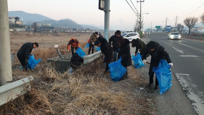 경기 포천시가 21일 설을 맞이해 귀성객과 시민들이 깨끗하고 청결한 환경에서 명절을 보낼 수 있도록 '국토대청소'를 펼쳤다. 이날 공직자와 환경미화원은 지역내 43번 국도변과 신읍동시가지 등을 중심으로 청소했다. 사진은 쓰레기를 수거하는 모습. (사진제공=포천시청)