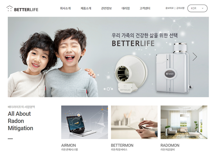 특히 기업 가치와 비전을 전달하기 위한 직관적인 디자인을 반영한 것이 눈에 띈다. 라돈저감전문기업란 주제로 라돈저감기와 라돈측정기 등 베터라이프의 주요 제품을 메인 페이지에 배치해 회사의 사업 분야를 명확히 설명했다.