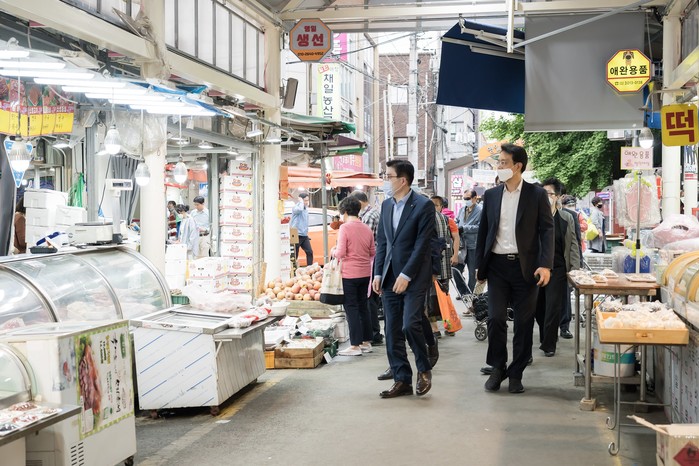 서울 강동구 명일전통시장(명일동 326-11에서 염주골 공원 일원 약 63m구간) 어닝 정비사업 완료에 이정훈 구청장이 시장을 방문해 설치구간 현장을 점검하고, 상인들을 만나며 시장의 생생한 목소리를 청취했다. 사진은 관계자들과 시장을 둘러보고 있는 이 구청장의 모습. (사진제공=강동구청)