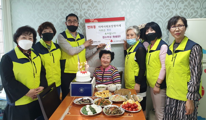 인천 서구 연희동 지역사회보장협의체가 25일 '홀몸 어르신 생신 챙겨드리기 사업'의 일환으로 지역내 생일을 맞은 홀몸노인 가정을 방문해 생일상과 함께 선물을 전달했다. 사진은 협의체 위원들이 생일을 맞은 노인과 기념촬영을 하는 모습. (사진제공=인천서구청)