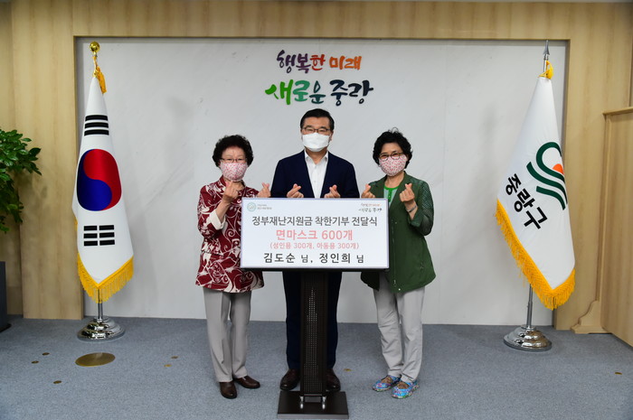 서울 중랑구는 1일 구청장실에서 김도순·정인희 자원봉사자로부터 정부 긴급재난지원금으로 제작한 면마스크를 전달받았다. 사진은 류경기 구청장(가운데)이 봉사자들과 기념촬영을 하는 모습. (사진제공=중랑구청)