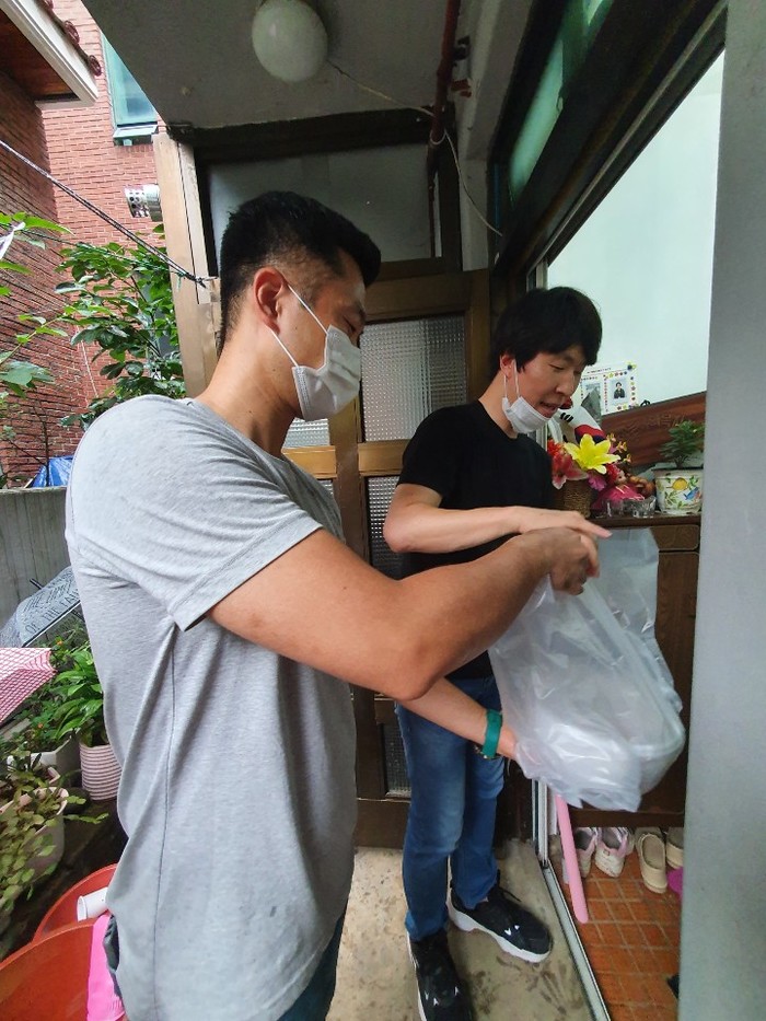 | '소셜다이닝' 참여자들이 반찬 나눔 봉사활동을 통해 관내 취약계층에 찜닭을 배달하고 있다. |
