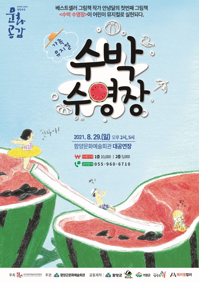 함양군은 오는 8월 29일 오후 2시, 5시 2회에 걸쳐 여름방학 끝자락에 온가족과 함께하는 ‘수박 수영장’창작뮤지컬을 함양군문화예술회관에서 선보인다.