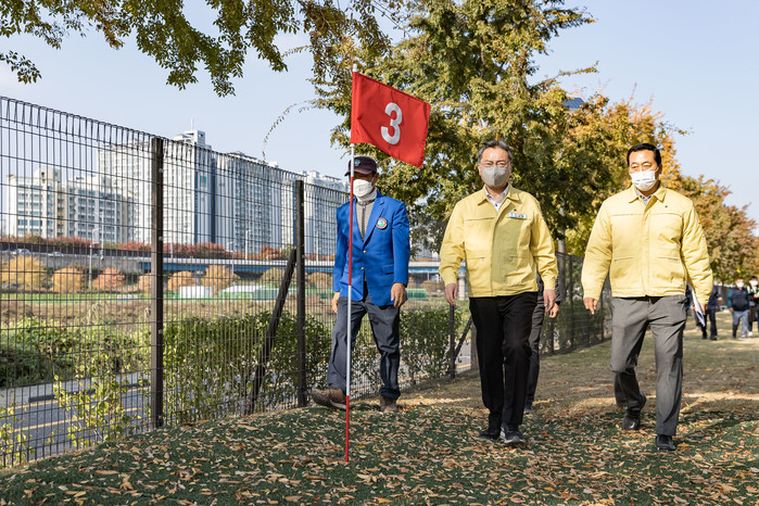 김선갑 서울 광진구청장은 3일 준공을 마친 중랑천 파크골프장 현장을 찾았다. 파크골프장은 총면적 8000㎡에 9개홀, 폭 5~25m, 부지연장 415m로 조성됐으며, 주민 편의를 위한 골프연습장, 클럽하우스 등 부대시설도 갖춰져 있다. 사진은 김 구청장(가운데)이 파크골프장을 방문해 둘러보고 있는 모습. (사진제공=광진구청)