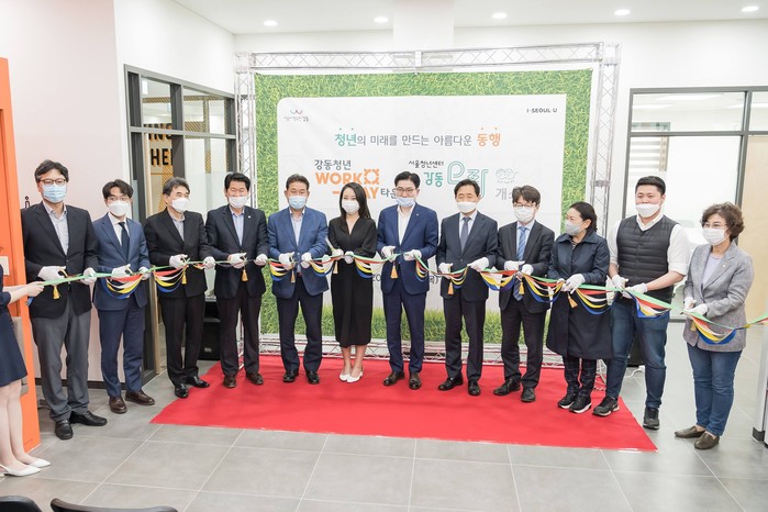 이정훈 서울 강동구청장이 최근 청년창업 입주공간인 ‘강동 청년work-play타운’과 청년정책 종합지원센터인 서울청년센터 강동 ‘오랑’ 개소식에 참석했다. 사진은 강동청년Work-Play타운 소셜라운지에서 열린 개소식에서 이 구청장(오른쪽 여섯 번째)이 테이프커팅을 하고 있는 모습. (사진제공=강동구청)