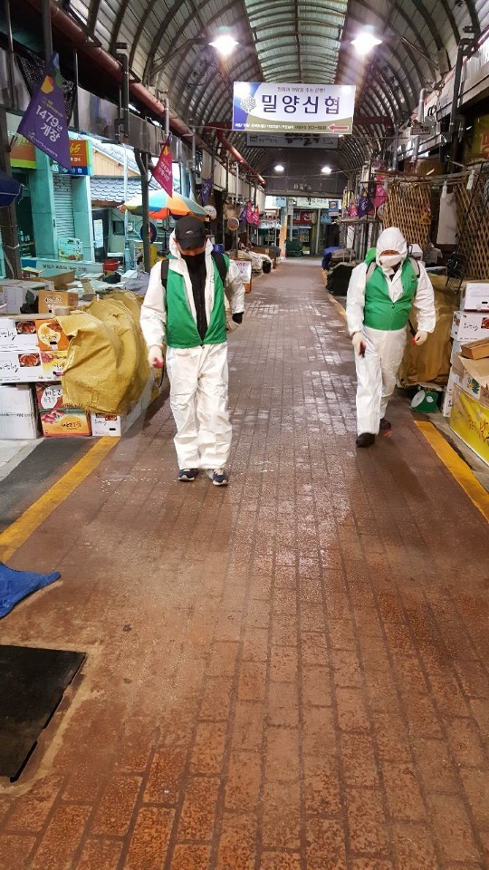 | 내일동 전통시장 일대에서 방역활동을 하고 있다. |