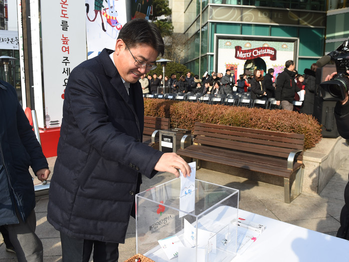노원구가 3일 노원역 롯데백화점 앞 광장에서 ‘사랑의 온도탑’ 제막식을 개최하고 본격적으로 오는 2020년 희망온돌 따뜻한 겨울나기 사업의 시작을 알렸다. 사진은 제막식에 참석한 오승록 구청장이 성금을 기탁하고 있는 모습. (사진제공=노원구청)