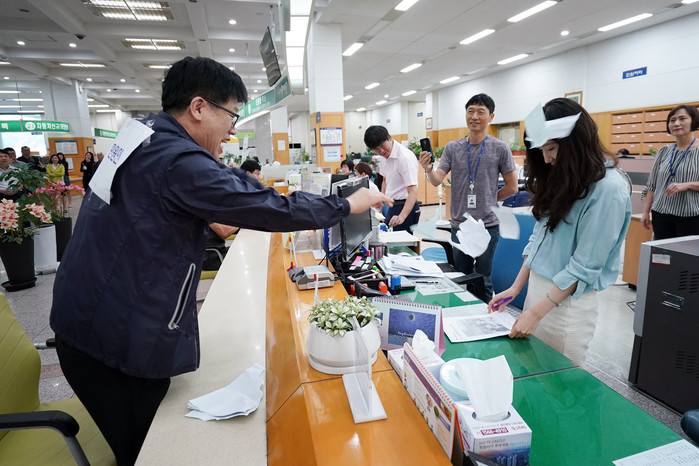 18일 서울 동대문구가 비상상황시 직원의 대응능력을 향상시키기 위해 구청 1층 종합민원실에서 ‘민원실 비상상황 대비 합동 모의훈련’을 실시했다. 사진은 모의훈련에서 위협 상황을 연출하고 하고 있는 직원들의 모습. (사진제공=동대문구청)