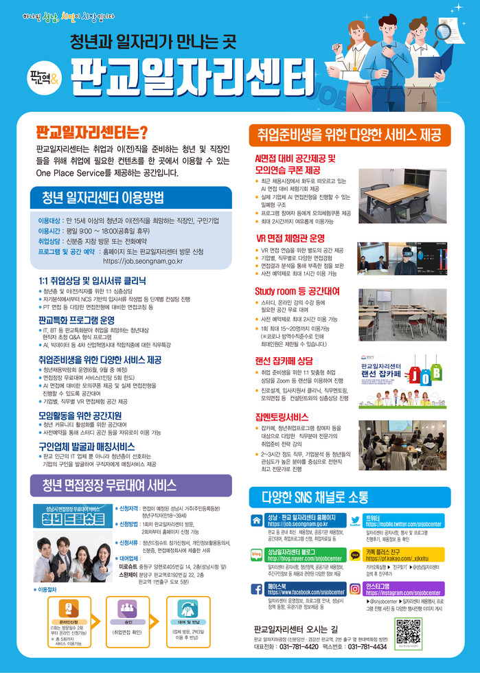 판교일자리센터는 판교역 연결 지하도로에 교육장, AI/VR룸, 상담실 등을 갖춰 178㎡(54평) 규모로 마련됐다.