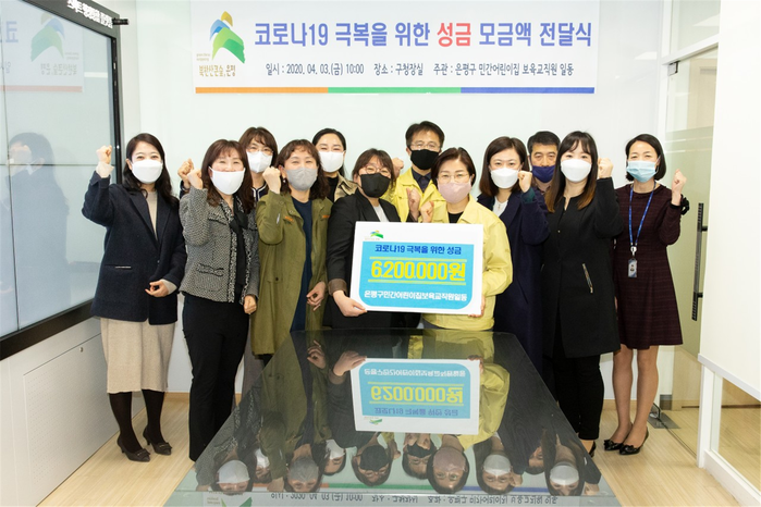 서울 은평구 민간어린이집 보육교직원 일동이 '코로나19 감염증 확대로 어려움을 겪는 이들을 위해 써달라'며, 구청에 최근 성금 620만원을 기탁했다. 사진은 성금을 전달받은 김미경 구청장이 보육교직원들과 기념촬영을 하고 있다. (사진제공=은평구청)
