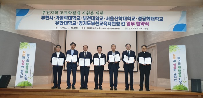 경기 부천시, 가톨릭대학교, 부천대학교, 서울신학대학교, 성공회대학교, 유한대학교와 경기도부천교육지원청은 16일 '부천지역 고교학점제 지원을 위한 업무협약'을 체결했다. 이날 기관장들은 부천지역 고교학점제 추진 계획과 지역사회 협력의 필요성을 공유했다. 사진은 협약 체결 후 장덕천 시장(가운데)과 관계자들이 기념촬영을 하는 모습. (사진제공=부천시청)