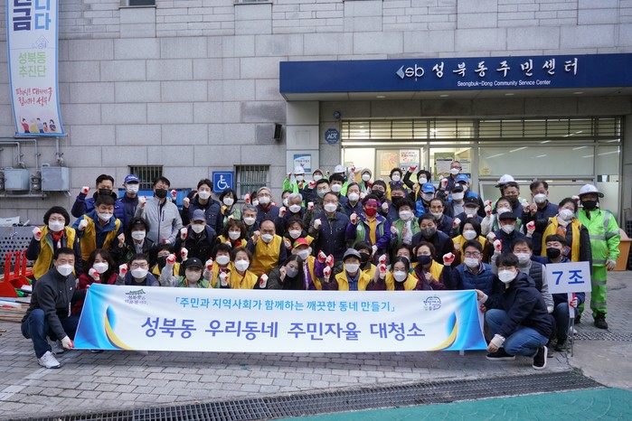 서울 성북구는 20개 전동에서 주민과 함께하는 청소를 진행하며 일상적 방역수칙 준수를 통한 성공적 위드코로나를 다짐했다. 사진은 3일 동네 청소를 위해 성북동 주민센터 앞에 모인 이승로 구청장(앞줄 맨 왼쪽)과 주민이 성공적 위드코로나를 다짐하며 '파이팅'을 외치고 있는 모습. (사진제공=성북구청)