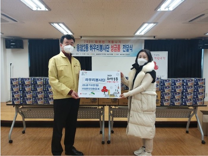서울 은평구 응암2동 주민센터는 최근 응암2동 하우리봉사단으로부터 따뜻한 겨울나기 성금품 전달식을 열고 성금 70만원과 라면 55상자를 받았다. 사진은 전달식에서 관계자들이 기념촬영을 하고 있는 모습. (사진제공=은평구청)
