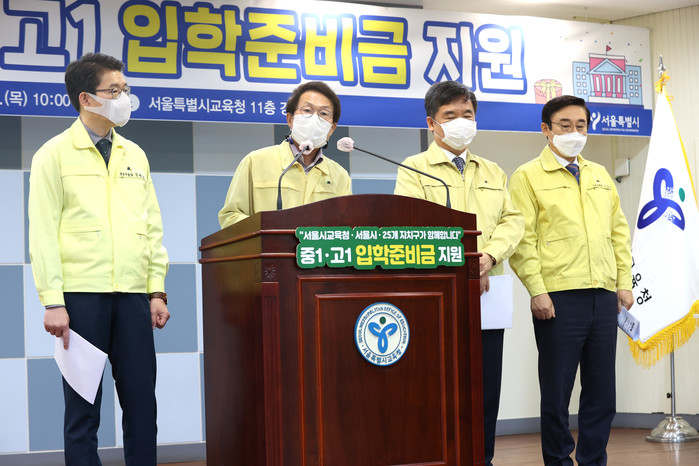 조희연 서울시교육감이 29일 오전 서울 종로구 서울시교육청에서 2021학년도 중학교와 고등학교에 입학하는 신입생들부터 입학준비금을 지원한다고 밝히고 있다. 왼쪽부터 정원오 성동구청장, 조희연 교육감, 서정협 서울시장 권한대행, 이동진 도봉구청장.
