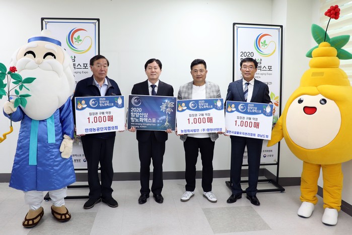 2020함양산삼항노화엑스포조직위원회(위원장 김경수 경상남도지사)는 26일 조직위 사무처장실에서 대한시설물유지관리협회 경상남도회(회장 손종근), 안의농공단지협의회(회장 임대원), ㈜함양산양삼(대표 이종상)과 예매입장권 구매 약정식을 가졌다고 밝혔다.