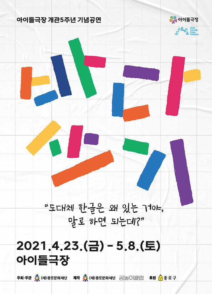 이번 공연은 구가 10여년간 주력하고 있는 한(韓)문화 활성화 사업 중 ‘한글’을 주제로 기획된 것으로, 오늘날을 살아가는 아동청소년에게 한글의 중요성과 소중함을 일깨워 주고, 과도한 디지털 매체 사용으로 글쓰기의 중요성을 잊고 사는 현대인의 모습을 극중 인물에 투영함으로써 생각해 볼 거리를 제공할 예정이다.