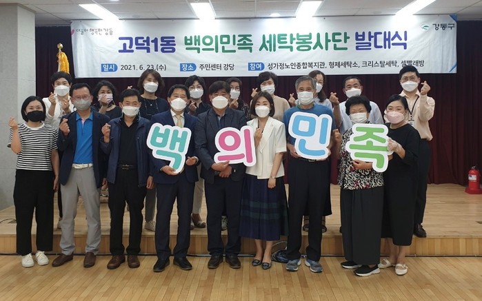 서울 강동구 고덕1동이 지난 23일 1인 가구 돌봄체계 구축을 위해 ‘백의민족 세탁봉사단’ 발대식을 개최했다. 세탁봉사단은 고령층 1인 가구를 방문해 생활교육·안전확인 등의 맞춤형 돌봄 서비스와 이불·의류세탁 서비스를 지원한다. 사진은 발대식에서 관계자들이 기념촬영을 하는 모습. (사진제공=강동구청)