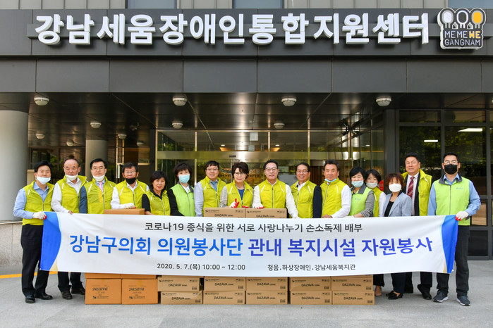 [시민일보 = 이대우 기자] 서울 강남구의회(의장 이관수) 의원봉사단이 최근 지역내 복지시설인 청음복지관, 하상장애인복지관, 강남세움 장애인통합지원센터를 차례로 방문해 손세정제 등 후원물품을 전달하는 자원봉사활동을 펼쳤다.