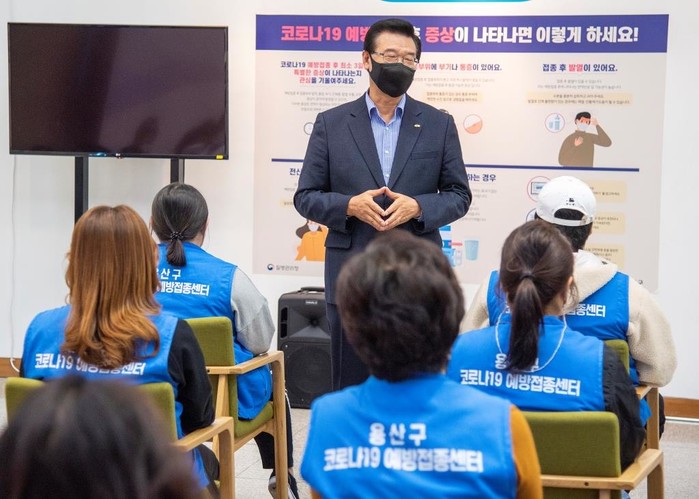 서울 용산구는 최근 코로나19 예방접종센터 해단식을 열었다. 센터 운영 종료 이후 백신 접종은 위탁의료기관 접종 체제로 전환되며, 추가접종 대상자를 비롯해 12~17세 소아 청소년·임신부 등에 대한 접종을 이어간다. 사진은 해단식에서 성장현 구청장(가운데)이 센터 근무자들에게 감사인사를 하고 있는 모습. (사진제공=용산구청)