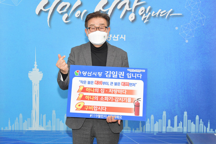 김일권 양산시장은 25일 소화기·화재경보기 등 소방시설의 중요성을 알리고 소방시설 설치를 독려하기 위해 진행 되고 있는 `119릴레이 챌린지’에 동참했다.