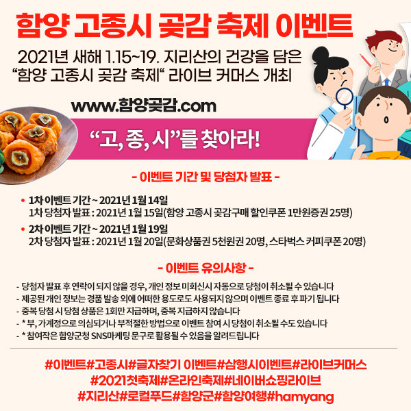 군에 따르면 오는 1월 15일부터 19일까지 온라인으로 진행되는‘제5회 함양 고종시 곶감축제’ 기간 중 ‘고, 종, 시’ 3행시 이벤트와 ‘고, 종, 시’ 간판 글자 이벤트를 실시한다.