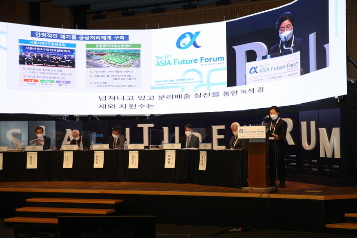김미경 서울 은평구청장이 최근 ‘제11회 아시아미래포럼’ 2일차 일정(세션4 : 로컬의진화:코로나 시대 지방정부와 시민사회) 토론회에 발표자로 참여했다. 사진은 토론회에서 김 구청장(오른쪽)이 지역과 시민이 함께하는 지역우수 정책사례로 은평구의 재활용 사업에 대해 발표를 하고 있는 모습. (사진제공=은평구청)