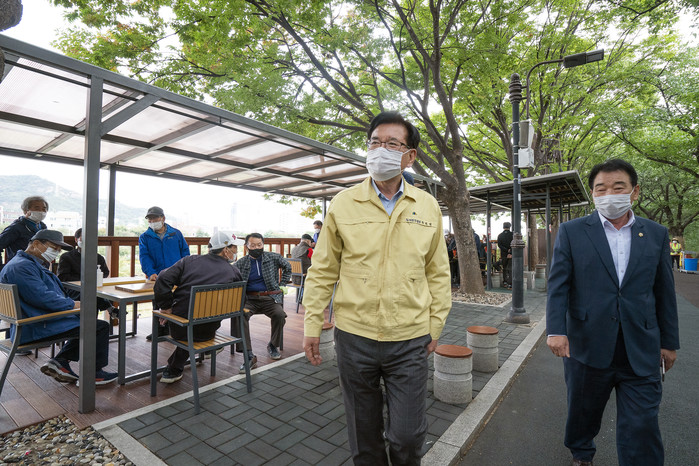 유덕열 서울 동대문구청장이 지난 13일 최근 개장한 '벚꽃길 어르신 쉼터'(장안1동 8-3)를 방문해 현장을 살폈다. 구는 중랑천 제방 산책로에 기존에 있던 장기쉼터에 목재데크 등을 설치, 공간을 확장·조성하고 벚꽃길 어르신 쉼터로 명칭을 정했다. 사진은 유 구청장(왼쪽)이 벚꽃길 어르신 쉼터를 방문해 시설을 살펴보고 있는 모습. (사진제공=동대문구청)