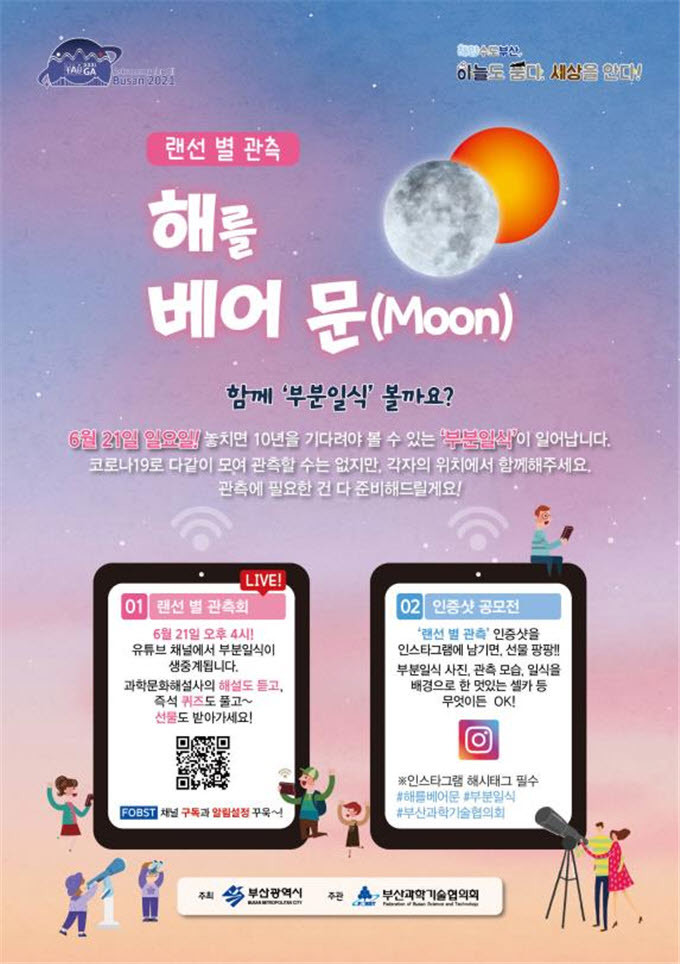 부산시(시장 권한대행 변성완)와 (사)부산과학기술협의회가 6. 21. 오후 4시부터 유튜브를 활용, 온라인으로 2시간 동안 부분일식 현상을 생중계할 예정이다.