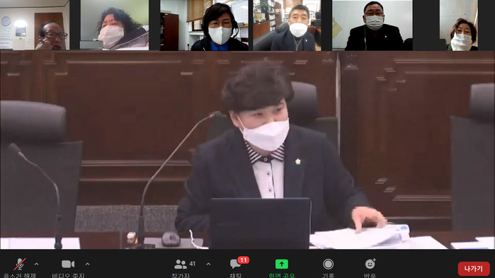 | ▲ 김명희 의원이 비대면 화상시스템을 통해 연구용역 최종 보고회 및 토론회를 진행하고 있다. (사진제공=강북구의회) |