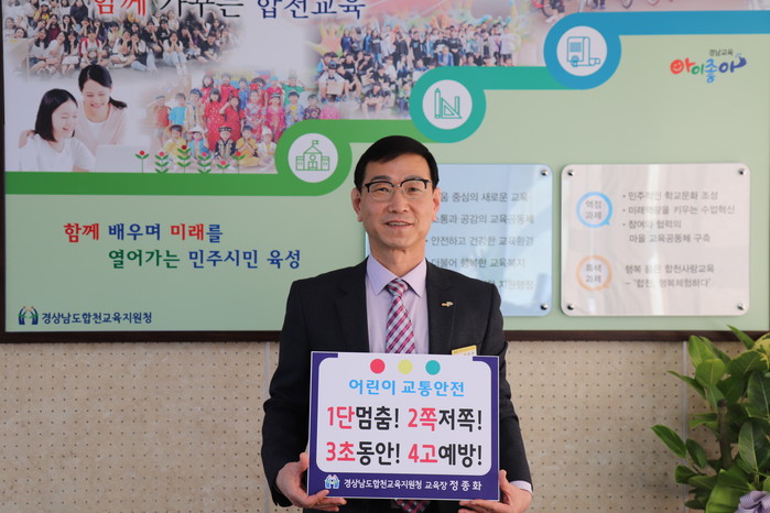 합천교육지원청(교육장 정종화)은 3월 9일(화) 어린이교통안전에 대한 국민적 관심을 높이고 어린이 보호 최우선 문화를 확산하기 위한 “어린이교통안전 릴레이 챌린지”에 동참하였다