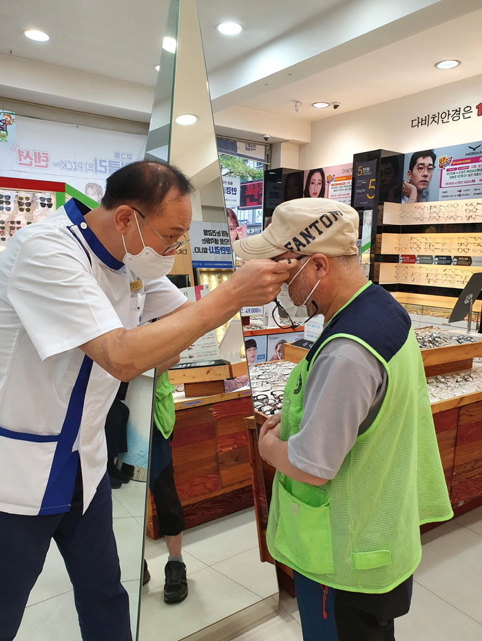경기 수원시 권선구 권선1동 다비치안경 갤러리점에서는 이달부터 저소득 노인 및 한부모 가정 등 저소득 취약계층 5가구에 매월 안경을 무료로 지원해주기로 했다. 사진은 다비치안경 갤러리점 안효열 대표가 대상 노인에게 안경을 씌워주고 있는 모습. (사진제공=권선구청)