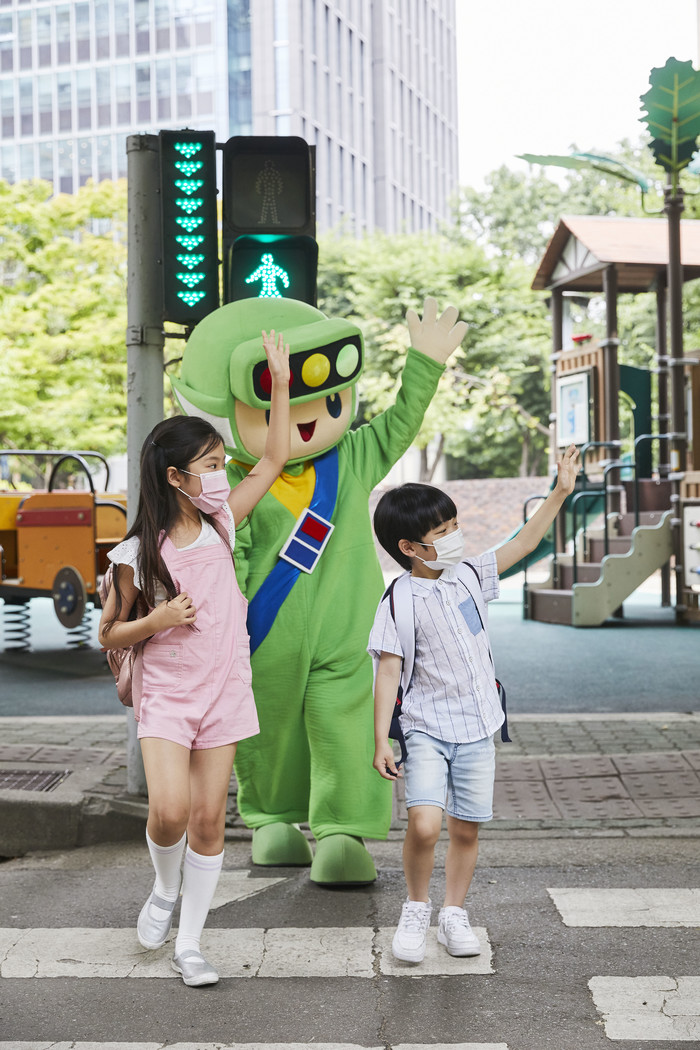 도로교통공단이 지난 23일 민식이법 시행 3개월을 맞아 서울 송파구에 위치한 어린이교통공원에서 스쿨존 내 어린이 교통안전을 독려하는 안전교육 행사를 진행했다. 사진은 참가한 어린이들이 손을 들고 좌우를 살피며 길을 건너고 있다.