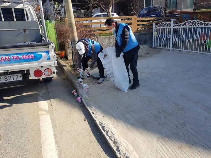 경기 양평군이 최근 양평읍과 옥천면 일대에서 불법광고물 잔재물 일제 정비를 했다. 이날 군과 양평광고협회 회원 20여명은 가로등 등에 불법 게시된 현수막 제거 후 남은 노끈, 벽보 등의 잔재물 500리터가량을 제거했다. 사진은 잔재물을 치우고 있는 모습. (사진제공=양평군청)