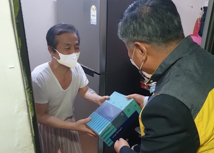 서울 광진구 자양4동 주민센터와 자양4동지역사회보장협의체가 최근 저소득 중·장년 홀몸가구에 과일·채소 등 식품과 생활용품으로 구성된 장바구니 꾸러미를 전달했다. 사진은 협의체 관계자가 홀몸가구에 장바구니 꾸러미를 전달하며 안부를 묻고 있는 모습.(사진제공=광진구청)