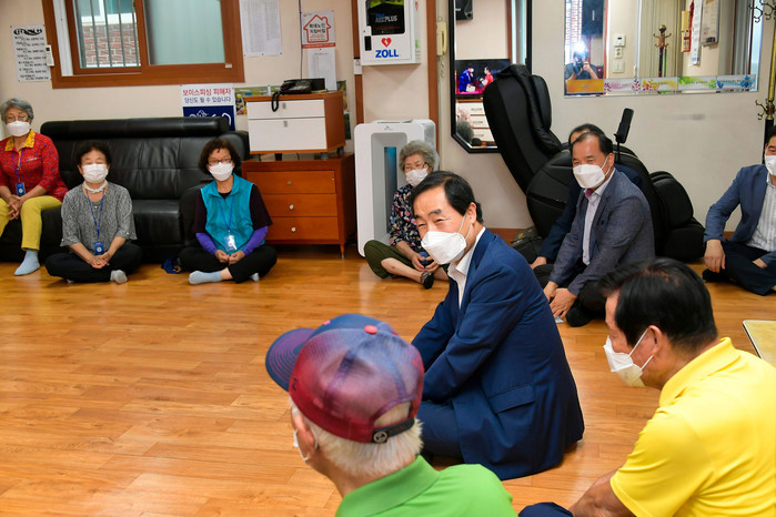 문석진 서울 서대문구청장이 28일 홍은2동 논골문화원 경로당을 방문해 주민들의 안부를 확인했다. 구는 지역내 각 경로당의 무더위쉼터 운영을 재개하고 2차 예방접종 완료자들이 방역지침을 준수하며 이용할 수 있도록 하고 있다. 사진은 이날 문 구청장이 노인들과 대화하고 있는 모습. (사진제공=서대문구청)