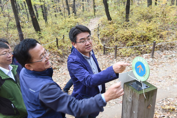 서울 노원구는 12일 불암산 둘레길을 대상으로 안전사고 예방을 위해 편의시설 및 훼손 시설, 둘레길 노선, 안전난간 및 안내체계 등에 대해 현장점검을 했다. 사진은 오승록 구청장(오른쪽)이 관계자들과 함께 둘레길을 살펴보고 있는 모습. (사진제공=노원구청)
