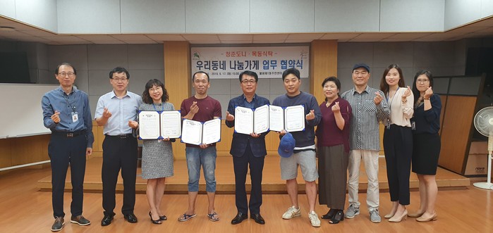 서울 은평구 불광제1동 주민센터가 최근 ‘목동식탁’, ‘청춘도니’와 함께 업체 고유의 물품 또는 서비스를 기부해 지역의 어려운 이웃을 돕는 ‘아름다운 이웃, 우리동네 나눔가게’사업 협약을 맺었다. 사진은 협약 후 기념촬영을 하고 있는 구 관계자들과 식당 주인들의 모습. (사진제공=은평구청)