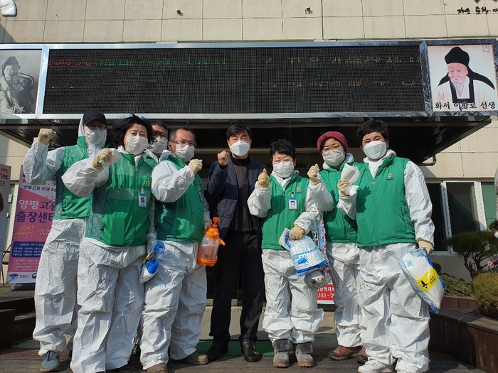 경기 양평군 서종면 새마을회는 최근 서종우체국 앞에 마스크 구매를 위해 줄을 선 주민들의 불편을 최소화하기 위해 방풍 천막과 의자를 설치해 앉아서 대기할 수 있도록 하고 추위를 녹일 수 있도록 차를 대접했다. 사진은 기념촬영을 하는 모습. (사진제공=양평군청)