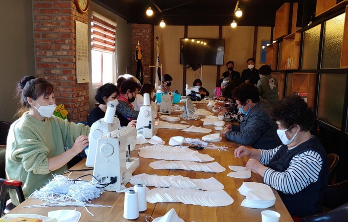경기 양주시 은현면 주민자치위원회를 비롯한 새마을부녀회, 방위협의회, 적십자은현봉사회, 생활개선회는 최근 지역내 외국인 근로자를 위한 면 마스크 1000여장을 직접 제작해 전달했다. 사진은 봉사자들이 마스크를 제작하고 있는 모습. (사진제공=양주시청)