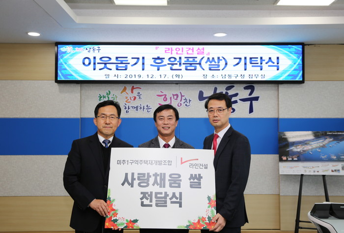 조합과 라인건설은 지난 17일 인천시 남동구청과 간석1동, 간석4동, 주안2동 행정복지센터를 방문해 연말을 맞은 학생과 주민들이 따뜻한 연말연시를 보낼 수 있도록 지원하기 위한 10kg쌀 400포를 전달하는 '사랑채움 쌀' 전달식을 가졌다.