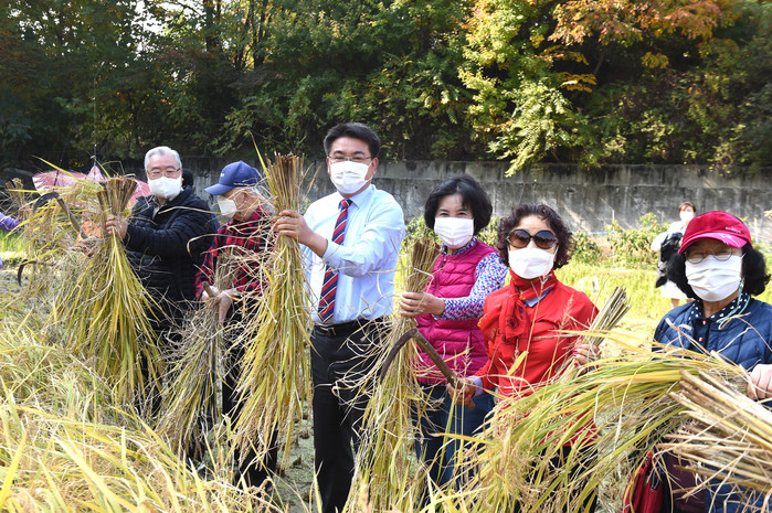 오승록 서울 노원구청장은 3일 마들근린공원 내 벼농사 체험학습장에서 열린 마들농요와 함께하는 벼베기 체험행사를 방문했다. 사진은 행사장에서 오 구청장(가운데)이 참여한 주민들과 벼베기를 하고 있는 모습. (사진제공=노원구청)