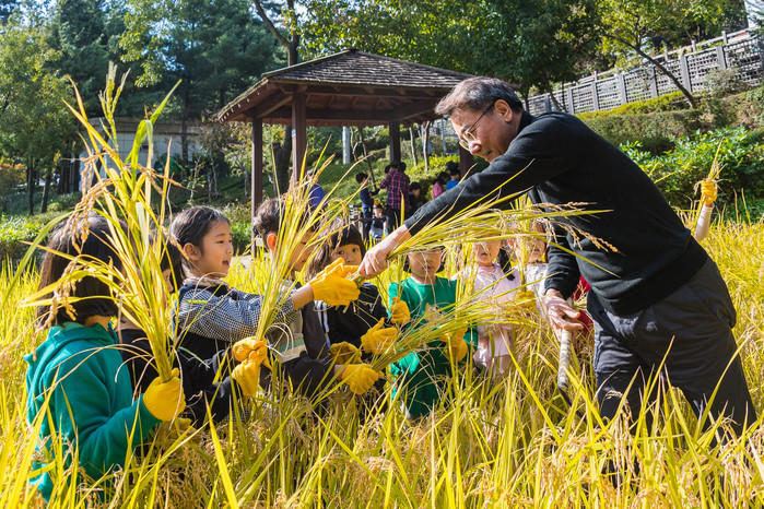 서울 광진구는 최근 아차산 생태공원 자연학습장내 관찰 논에서 어린이를 대상으로 ‘꼬마농부 벼베기 체험 프로그램’을 진행했다. 사진은 벼베기 체험 프로그램에서 벼를 수확하고 있는 아이들과 김선갑 구청장의 모습. (사진제공=광진구청)